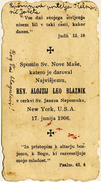 Podobica v spomin na novo mašo Alojzija Blaznika: prva (barvna) in zadnja stran (tekst).